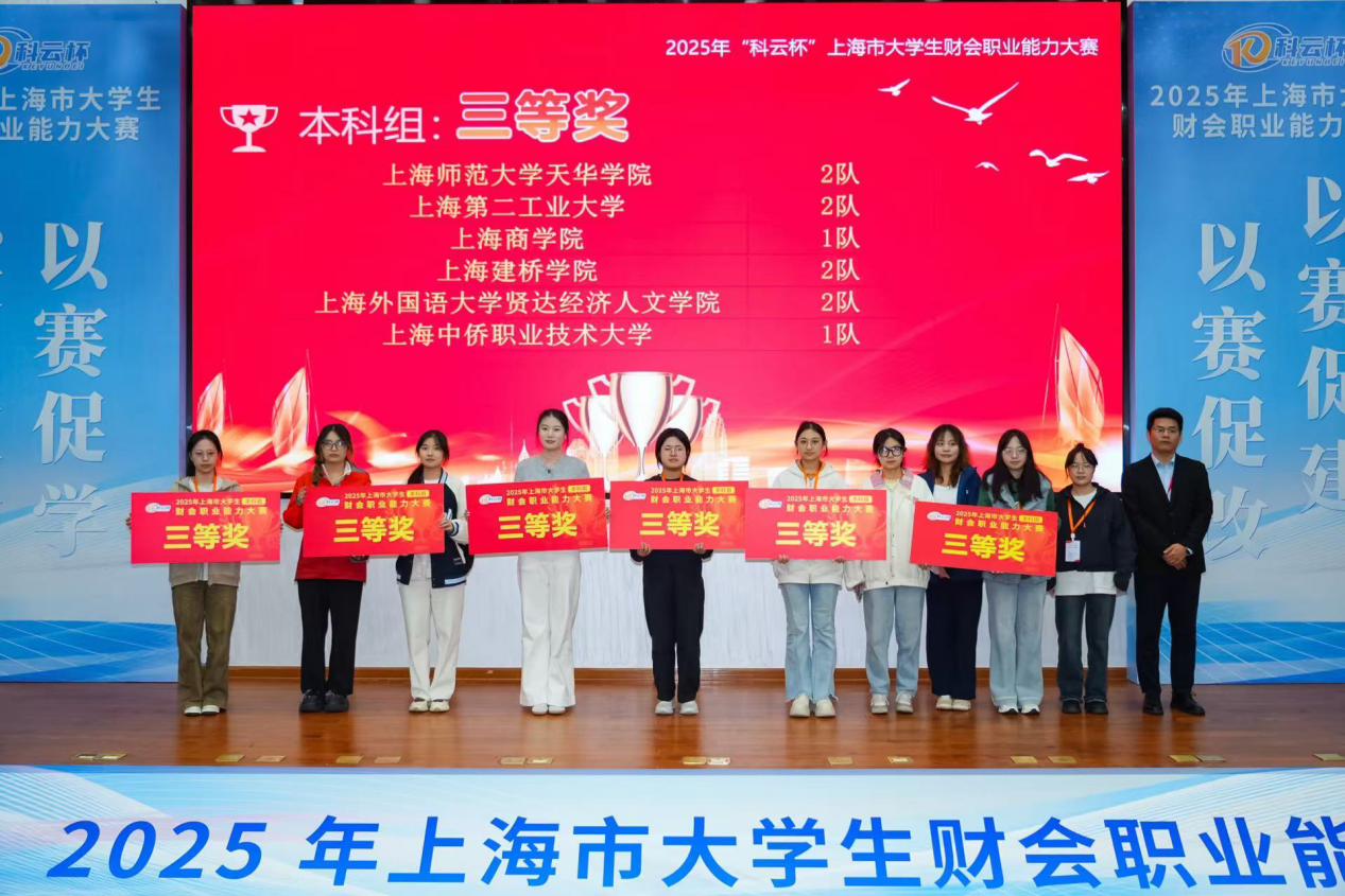 11月9日,由上海市教育委员会主办、上海立信会计金融学院承办的2025年“科云杯”上海市大学生财会职业能力大赛成功举办。比赛共有来自同济大学、上海大学、华东理工大学等18所上海本科院校的35支参赛队伍。经过5小时的激烈角逐,我校会计学专业顾乐韵、葛伊琳、倪琳、江心雨组成的代表队荣获二等奖,李娜、孙冬梅、何一诺、金卉组成的代表队荣获三等奖,比赛由黄怡婕、徐洁等老师指导。