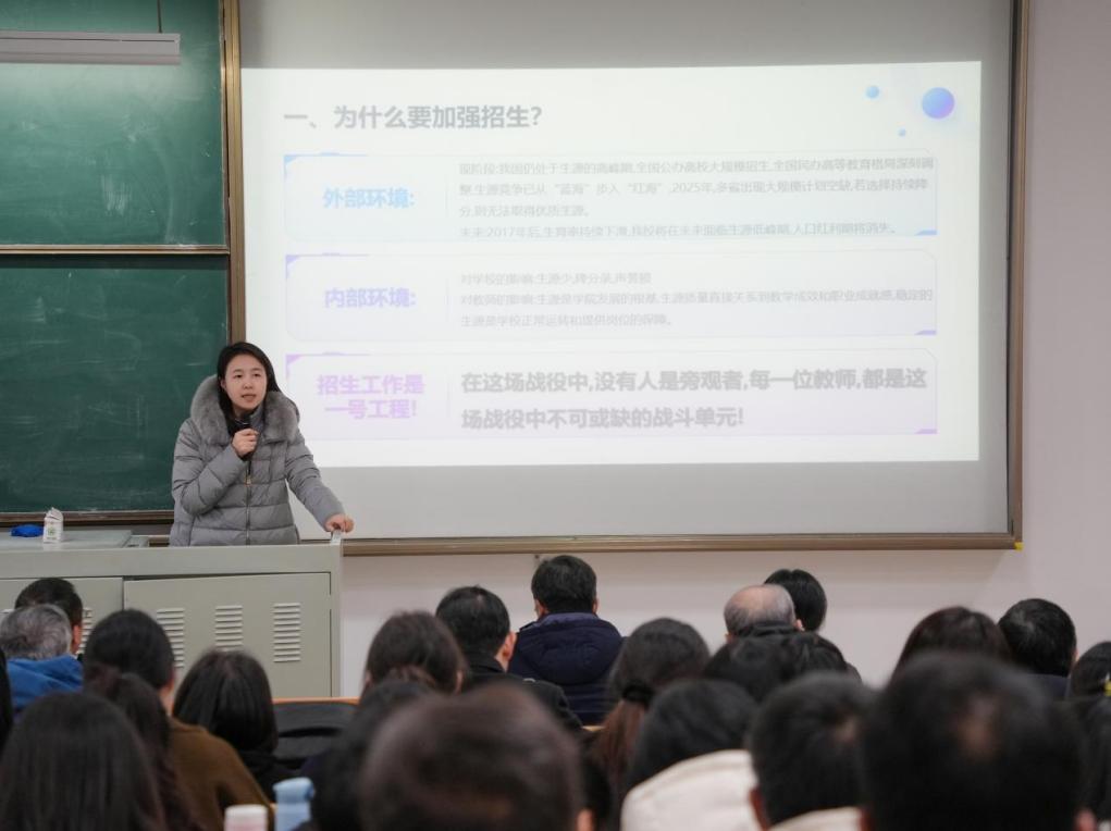 杜鹃书记首先从为什么要加强招生、为什么要走出去招生、如何走出去以及本年度学院要达成的目标等四个维度对招生相关工作进行部署,学院全体教职工将凝聚共识,精准发力,打赢生命线保卫战;然后,她从活动背景和活动内容解读关于《上海建桥学关于举办第五届“学风节”的通知》,重点从各类育人主体工作要求、“沉浸式课堂”示范班级评分细则等维度精准解读关于我校《秋季学期“沉浸式课堂”专项计划及示范班级评选工作方案》。