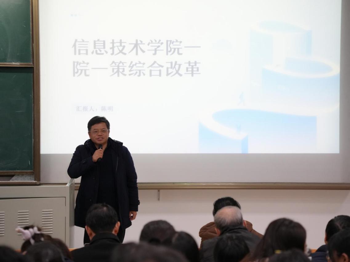 陈明教授从为什么要进行综合改革、学院的发展目标、专业布局规划与专业综合改革、培养方案优化调整、专业优化调整、AI+课程改革、师资队伍建设与人事制度改革等维度详细解读了学院一院一策综合改革方案,他希望老师们多提宝贵意见,携手推动学院高质量发展。