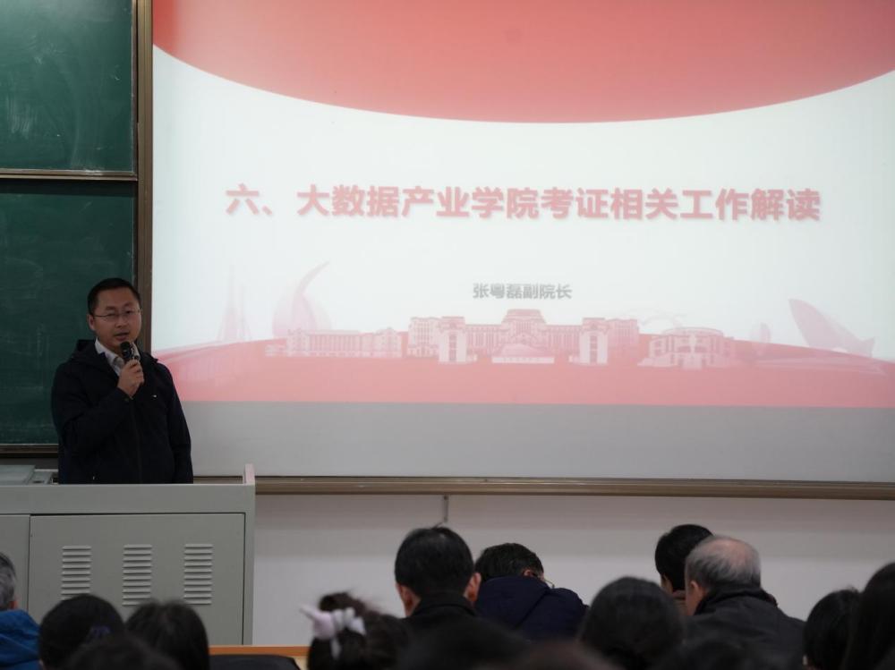 张粤磊副院长就大数据产业学院考证相关工作进行全面解读;考务负责老师陈峰对大学英语四六级考试和期末考试监考进行培训,他从监考员守则、监考员报到时间及地点、考试材料及用品领取、试卷发放及回收规则、监考工作要点及操作规程、监考注意事项等内容进行详细的讲解。