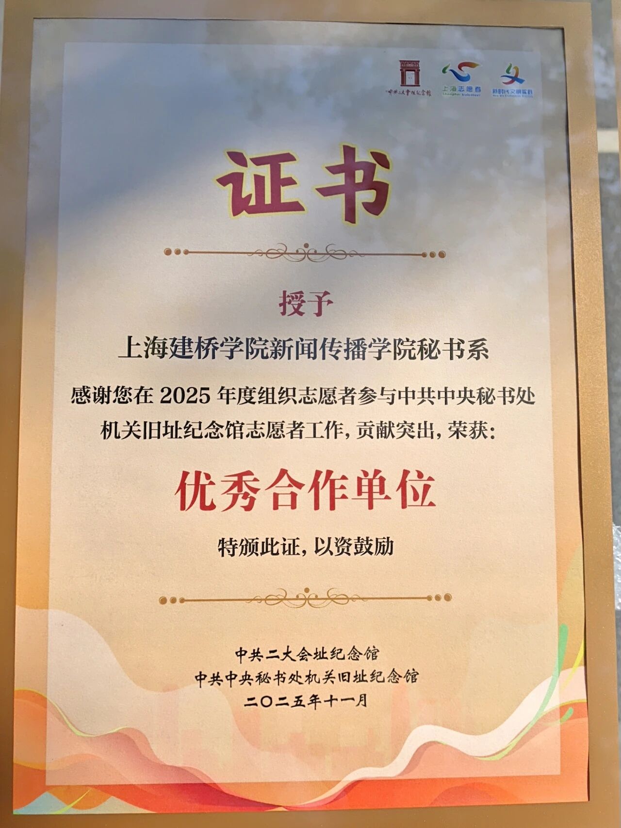 为深入学习宣传贯彻党的二十届四中全会精神,弘扬新时代雷锋精神,11月15日,中共二大会址纪念馆、中共中央军委机关旧址纪念馆、中共中央秘书处机关旧址纪念馆、中央特科机关旧址纪念馆,在上海市静安区青少年活动中心联合举办“志愿同心 公益领航”——2025年志愿者总结大会,我校新闻传播学院秘书系作为合作单位,在此次大会上荣获“优秀合作单位”称号,系主任吴美老师获得“卓越组织者”个人奖项,多名学生志愿者被评为“优秀志愿者”。