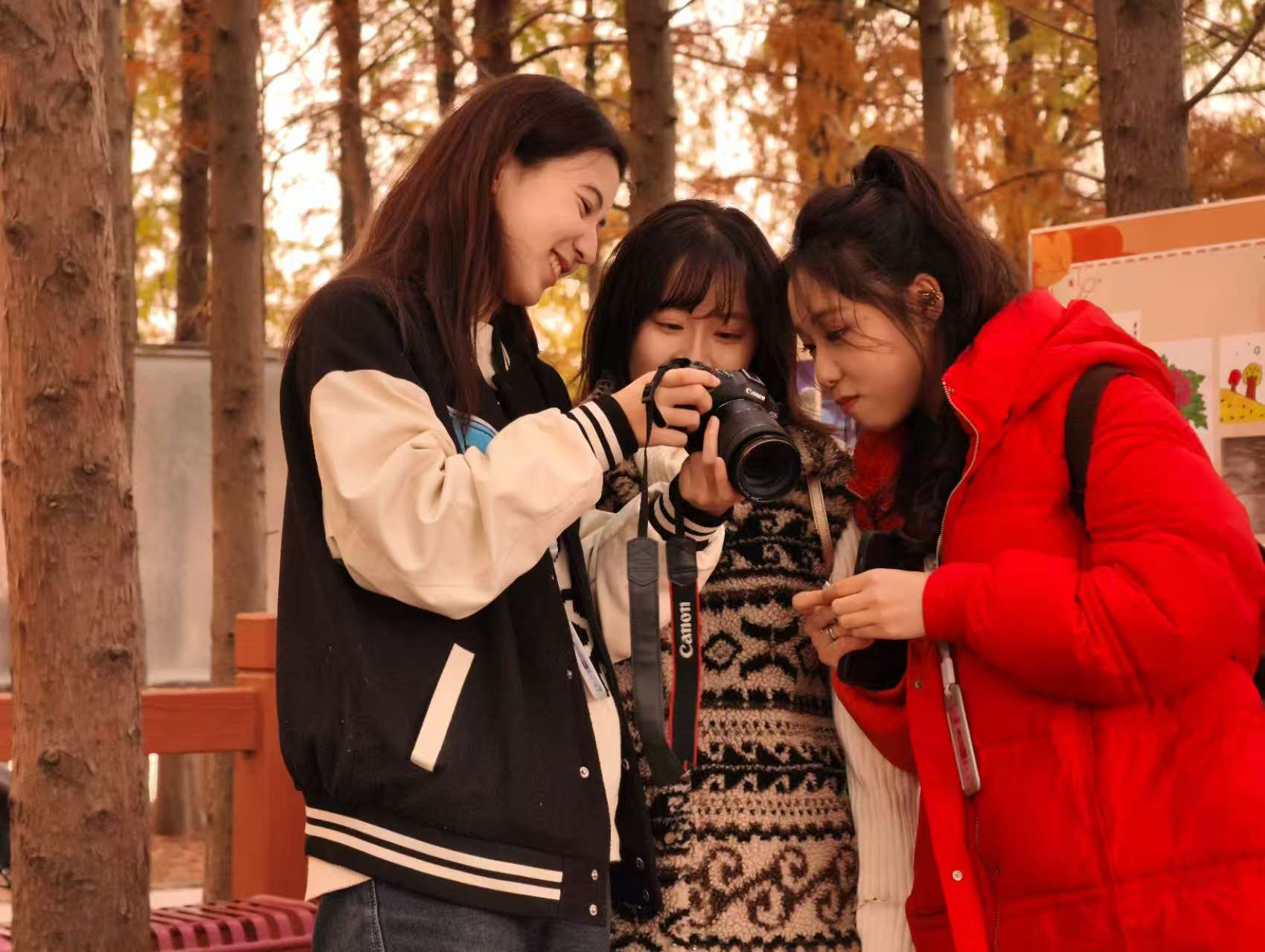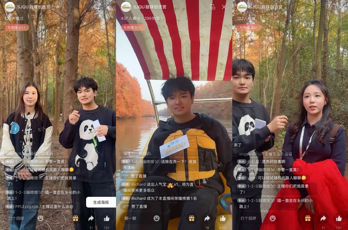 在层林尽染的自然课堂中,学生们按摄影、短视频创作、移动直播等方向分组,在专业教师与业界导师的联合指导下,迅速投入采拍实践。从踩点策划、现场拍摄到移动直播,师生共同研讨、协同执行,将课堂理论与真实场景紧密融合。直播小组在“SJQU融媒创造营”视频号进行接力直播,累计观看近千人次,评论区互动热烈;摄影与短视频创作小组的作品,也将有机会通过媒体平台展播,实现教学成果与社会传播的有效对接。