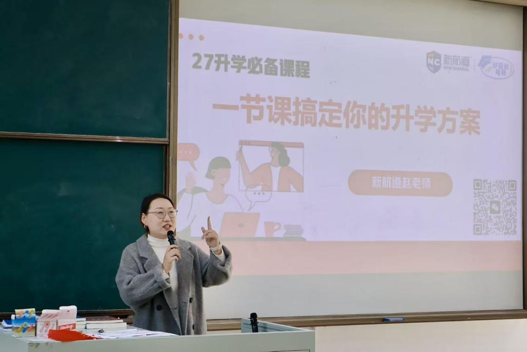 在备考规划环节,赵磊老师给出了分阶段备考建议:大一夯实学业基础、提升GPA;大二参与竞赛与实习,首考标化考试;大三强化语言成绩与科研经历;大四聚焦申请与面试。同时公布了新航道寒假打卡营课程安排,涵盖考研英语词汇、阅读、翻译、写作等核心模块,助力学子高效利用假期备战。