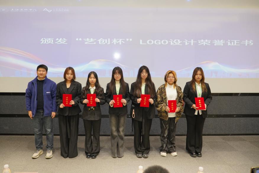 作为本次大赛的特色环节,LOGO设计专项赛结果率先揭晓。经过前期广泛征集,大赛共收到23份设计作品,通过“线上投票(30%)+专业评审(70%)”的综合评定,6份优秀作品脱颖而出。其中,艺术与科技 B23-3 姚梅莹的设计凭借鲜明的创意性与实用性斩获一等奖,其作品被正式确定为“艺创杯”创新创业大赛专属 LOGO;视觉传达设计 B25-3 汪楚秦、数字媒体艺术 B25-2 范可心获二等奖;艺术与科技 B25-2 徐诗媛、环境设计 B24-4 薛子琰等 3 人获三等奖。陆军副书记为获奖同学颁奖并合影,肯定了他们扎实的设计功底与灵动的创新思维。