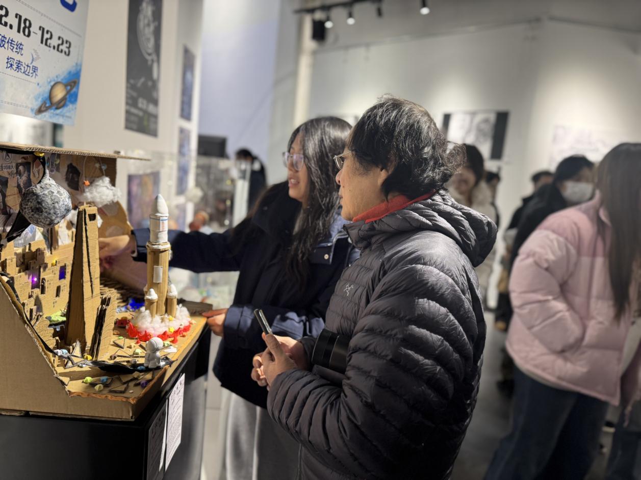 随后,Martin Dörbaum教授对本次展览进行介绍。据悉,本次展览的作品以“海洋与太空”为核心创作方向,均为艺术设计学院大师工作坊学员的创作成果,涵盖领域广泛,表现形式丰富多元。同学们巧妙运用传统手工艺、废旧材料改造等传统媒介,结合AI生成、交互装置等现代技术,打造出一系列兼具观赏性与思想性的作品。每个小组代表随后依次向师生们详细介绍了作品的创作理念、展示形式与核心内涵,现场作品亮点纷呈,从不同角度诠释了“太空中的艺术与设计”的主题。