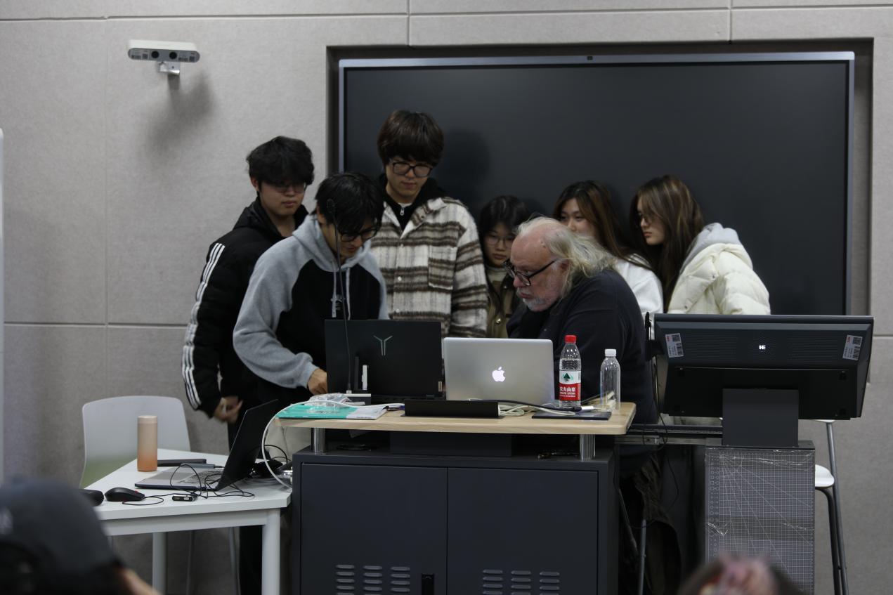 紧接着,“生成艺术与算法”专题讲座正式拉开帷幕。伴随着一段算法生成的背景音乐,Martin Dörbaum教授以“生成艺术与算法”为核心,系统梳理了二者的发展脉络与内在关联,深入浅出地阐释了算法的核心定义及其在艺术创作中的演进图景。教授还分享了算法在多元艺术领域的实践应用,提出艺术创作中不应过度依赖算法,需重视艺术家直觉与经验的重要观点。这场讲座为现场学生打开了艺科融合创作的新视野,不仅深化了大家对生成艺术与算法的认知,更启发同学们在今后的创作中积极平衡技术应用与创意表达,勇于探索艺术与科技融合的新可能。