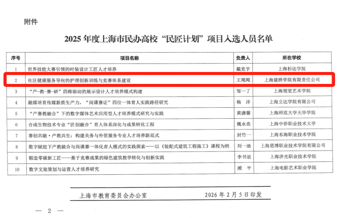 近日,2025年度上海市民办高校“民匠计划”项目入选名单揭晓。建桥健康管理学院养老服务管理系副系主任王飔飔,凭借其在应用型养老人才培养、创新创业教育及社会服务领域的突出表现,入选该计划。