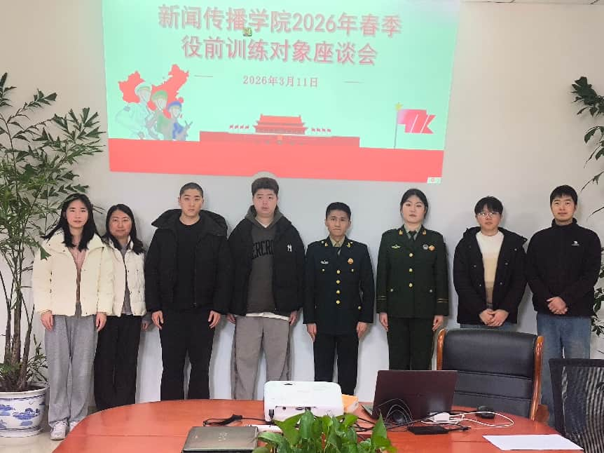 3月11日中午,新闻传播学院在学院楼219会议室举行2026年春季役前训练对象座谈会,为即将进入役前训练基地的杜任驰、宋忆两位同学送行。参加此次会议的有学院征兵负责人赵鑫老师、辅导员施艳林老师、靳雅丽老师、闻传当兵人协会会长马海珍及退伍学生刘俊杰、刘泽瑜。会议由学院征兵负责人赵鑫老师主持。