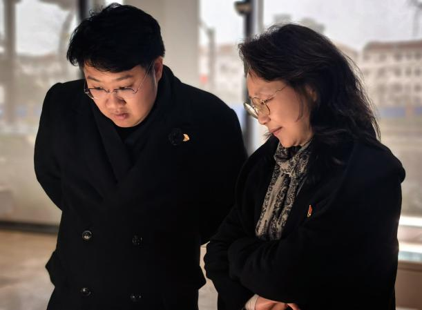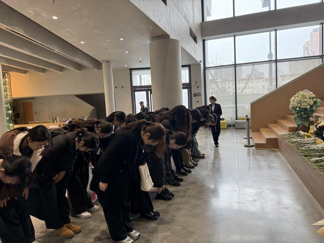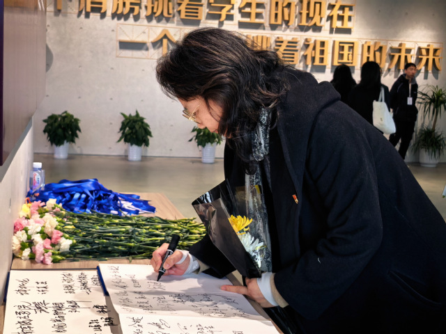 当日下午,师生们怀着崇敬之心抵达追思地点。在工作人员引导下,大家轻声步入庄严肃穆的追思大厅。于漪先生遗像悬挂正中,遗像前摆放着青翠花篮。全体师生肃立,依次鞠躬、默哀,并敬献鲜花,以朴素方式寄托对先生的深切缅怀。