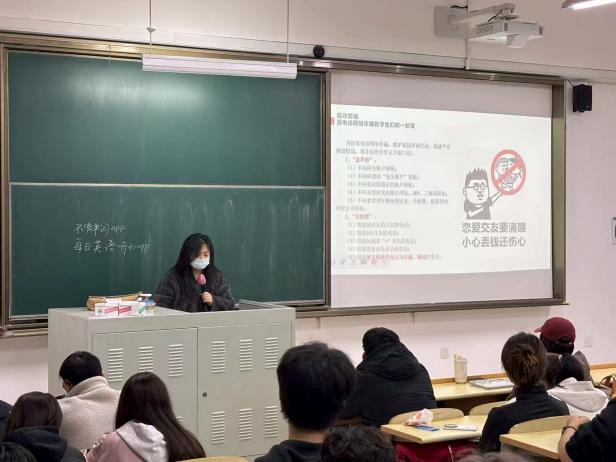 活动以近期高校频发的真实诈骗案例为切入点,为同学们敲响反诈警钟。宣讲过程中,老师们结合高校学生群体特点,详细拆解了刷单返利、游戏代练交易、冒充电商物流客服、冒充公检法、虚假购物服务、免费领礼品引流等校园高发诈骗类型的作案套路,全流程剖析了骗子引流、博取信任、实施诈骗、销赃跑路的完整链条,并针对不同骗局给出了精准的防范提示。为让学生真正掌握可落地、能用上的反诈方法,活动重点讲解了国家反诈中心APP、96110 预警专线、12381 预警短信等六大官方反诈工具的功能与使用方法,手把手指导学生正确安装、开启预警功能;同时用通俗易懂的语言,讲解了“五不转”“五慎接”“六个一律”“十个凡是” 反诈核心口诀,把专业复杂的反诈知识转化为简单易记的行为准则,帮助学生快速掌握诈骗甄别技巧,提升自我防范能力。