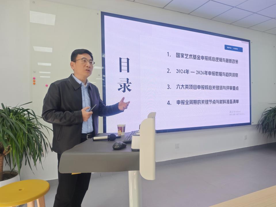 主题分享环节,王志强教授聚焦国家艺术基金与省级艺术基金申报,结合民办高校科研特点展开深度解读。他指出,相较于竞争激烈的国家社科基金,国家艺术基金更偏向实践应用,十分适合艺术设计类教师申报。王志强教授系统梳理了国家艺术基金的设立背景、管理架构与2026年最新政策变化,重点分析了近三年申报数据与立项趋势,明确重大主题、中华优秀传统文化、乡村振兴、生态文明等为核心选题方向。他详细拆解大型舞台剧、美术创作、传播交流推广、艺术人才培训等六大类项目的申报关键词与评审要点,特别强调青年艺术人才项目新增艺术设计人才方向,为我院教师量身打造申报突破口。