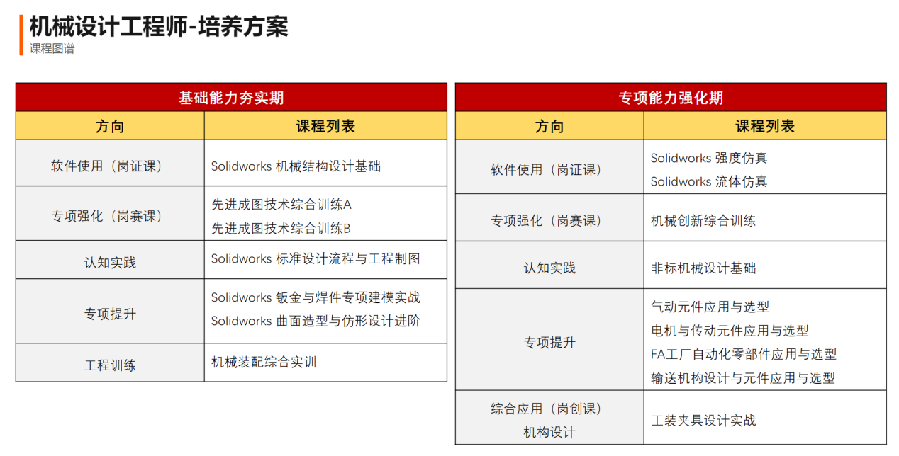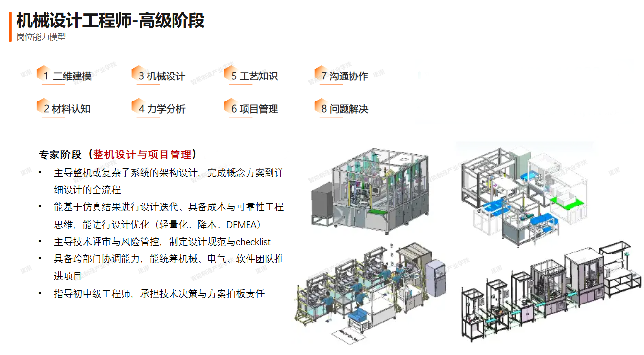 机械设计师不仅要负责产品从概念到生产的全过程设计,还肩负着提升产品竞争力和市场适应性的重任。8项核心能力包括三维建模、材料认知、机械设计、力学分析等,三阶段为“入门—进阶—专家”横向递进。为此,学院重构了三阶递进式培养方案(基础能力夯实期→专项能力强化期→综合能力实战期),配套开发了多门项目化实战课程(如双层倍速链流水线、折叠机等),构建了调研—标准—课程—实战—评价的项目化课程开发标准,形成了校企协同、课证融通、赛教结合的机械设计工程师岗位嵌入式人才培养体系。