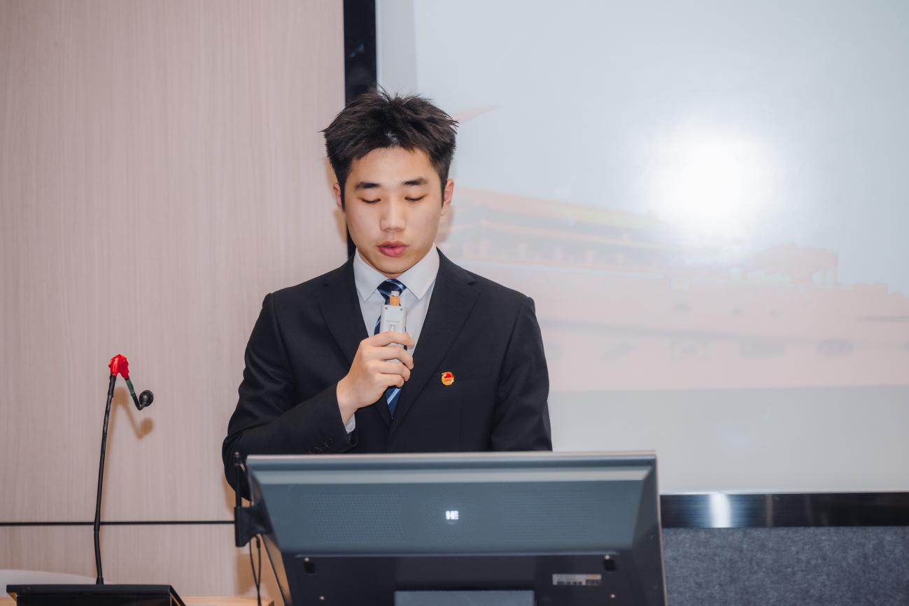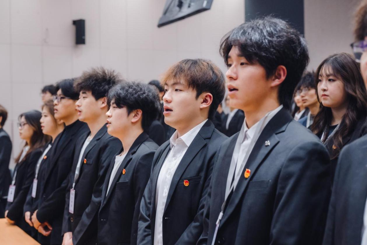大会伊始,主持人陆君豪逐一介绍莅临现场的老师与嘉宾,宣布大会正式拉开帷幕。全体起立,出团旗、奏唱团歌,嘹亮的歌声回荡在会场,彰显着团学青年的赤诚初心与昂扬风貌,为本次大会奠定了庄重而热烈的基调。