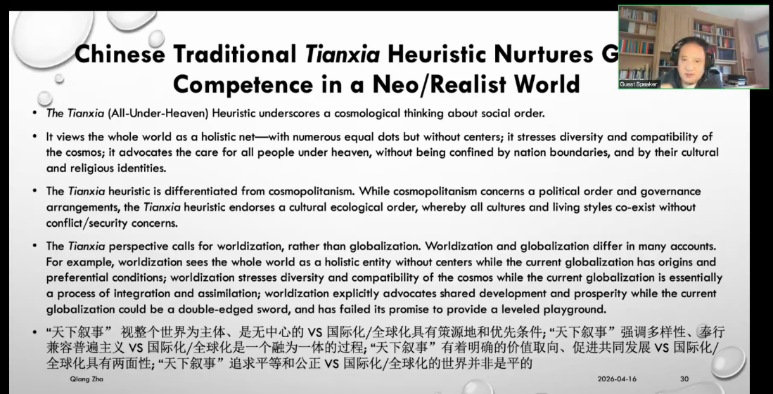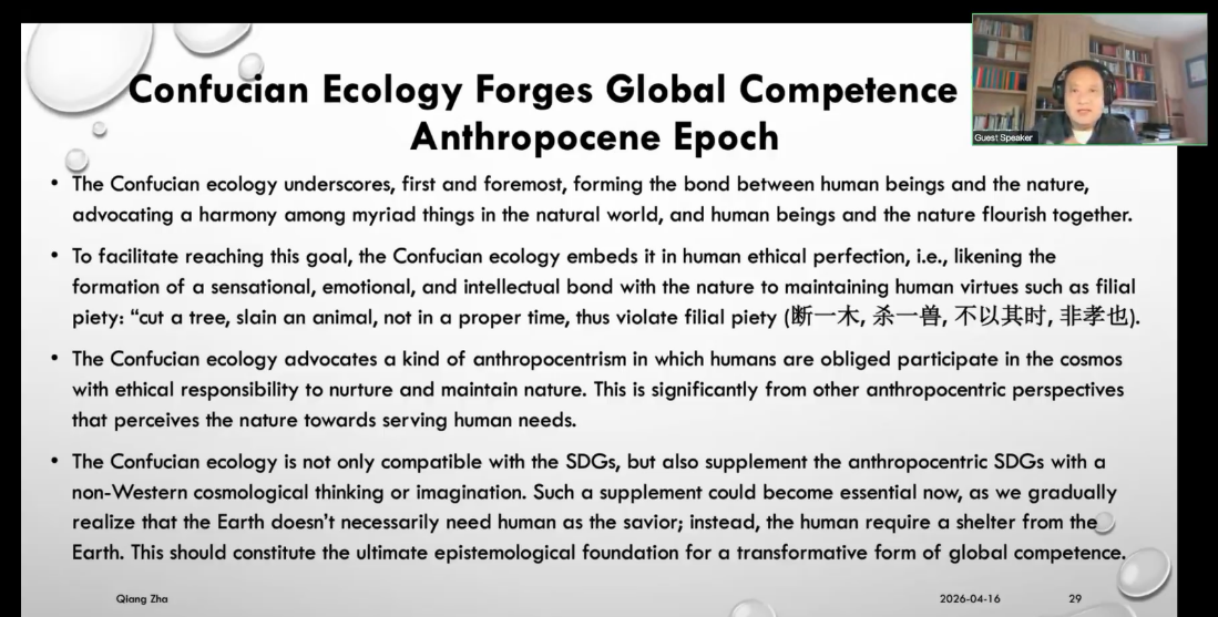 值得关注的是,查教授特别强调了中国传统文化在全球胜任力教育中的独特价值。他以儒家“天人合一”的生态观与“天下”视野为例,展示了中国文化在理解人与自然关系、促进多样性共存等方面的深厚资源,为全球胜任力教育提供了重要的哲学启发与文化支撑。