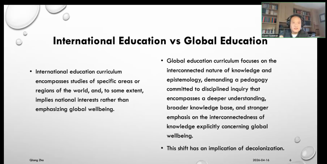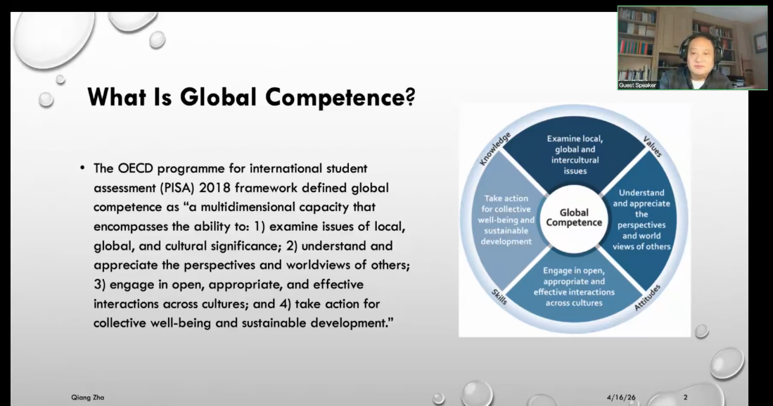 本次讲座邀请加拿大约克大学国际高等教育专家查强教授主讲,围绕“全球胜任力教育的范式升级”展开深入分享。查教授从全球教育发展的最新趋势切入,指出全球胜任力已从传统的“跨文化理解”拓展为能够“采取行动促进集体福祉和可持续发展”的综合能力,标志着教育理念从跨文化能力向全球胜任力的系统性跃升。