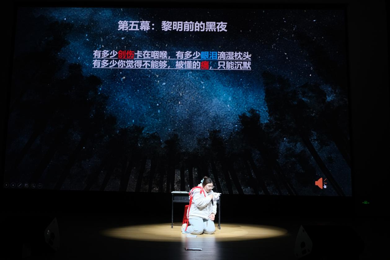 获得二等奖的剧目《我的勇气叫黎梨》,则聚焦于“自我突破与勇气成长”。该剧以主角“黎梨”的校园生活为叙事主线,通过课堂发言、社团活动、人际交往等真实场景,细腻再现了一名内向学生从胆怯退缩到勇敢表达的心路历程。剧目核心立意深刻——“勇气不是没有恐惧,而是带着恐惧前行”,并以温暖治愈的剧情,向观众传递了“每个人都能成为自己的光”的坚定信念。演员们自然真挚的演绎,引发了全场观众的强烈共鸣,展现了新时代大学生向阳而生、勇于突破的精神风貌。
