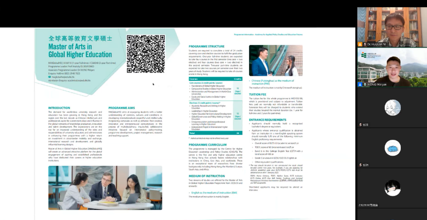 讲座的后半部分,熊教授向参会师生介绍了香港教育大学“全球教育硕士”项目的培养特色,包括实践与学术双轨制路径、国际化学习环境以及对未来博士研究的良好衔接,吸引了在场同学的浓厚兴趣(项目介绍链接:https://www.kdocs.cn/l/cm55D3Lk8gt1)。