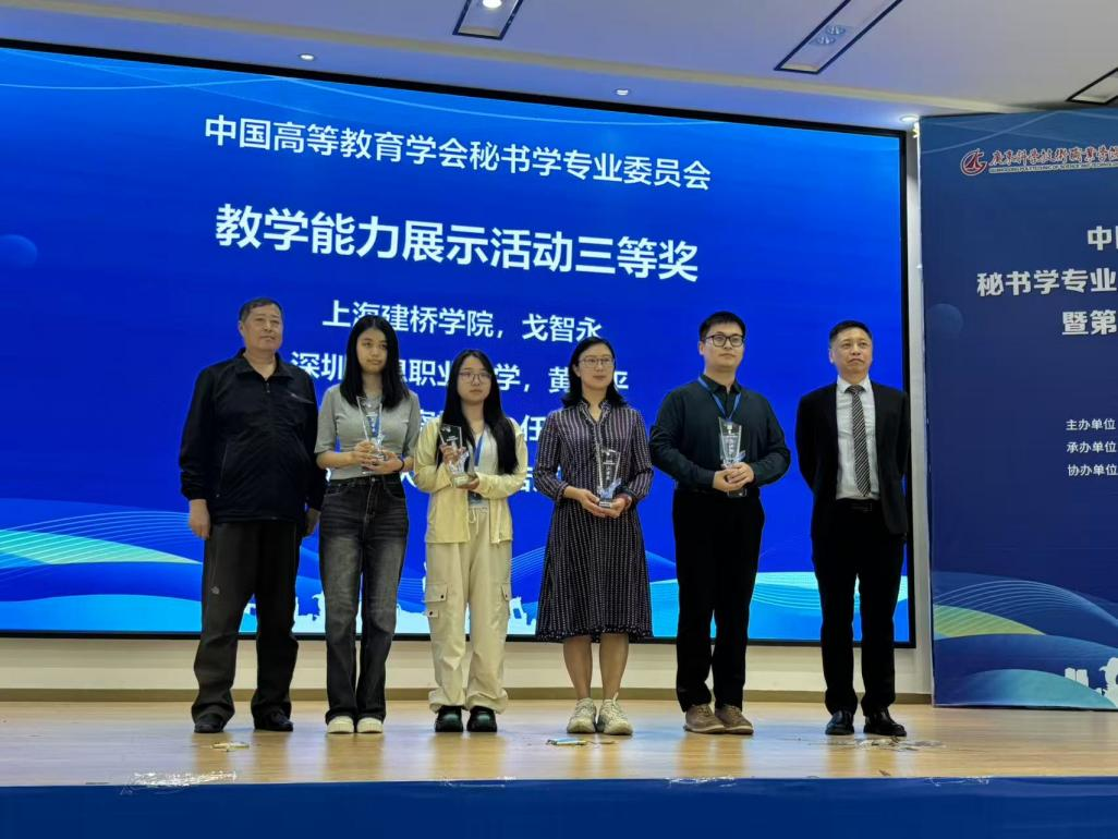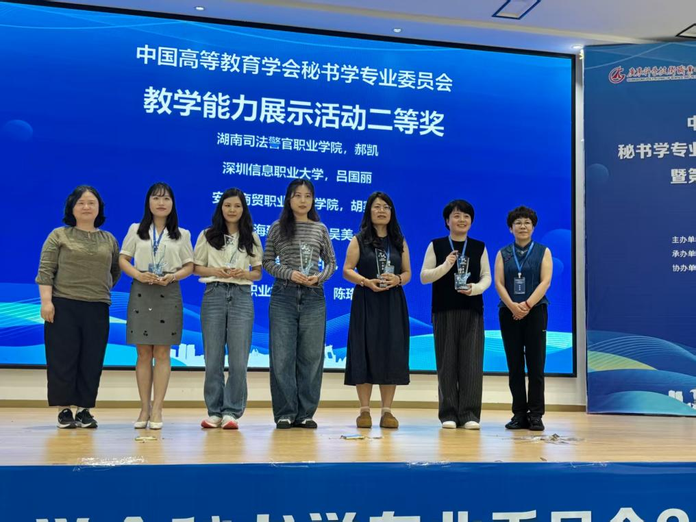 会议期间还举办了教学能力展示比赛。新闻传播学院秘书系主任吴美、办公室主任戈智永,凭借将AI技术融入秘书学专业教学、重构教学场景的创新实践,分别荣获二等奖与三等奖,展现了新闻传播学院以技术赋能专业建设的最新成果。