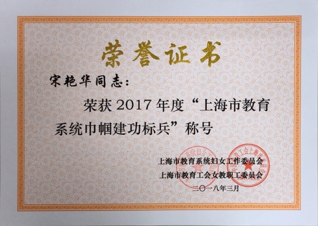 宋艳华 荣获2017年度“上海市教育系统巾帼建功标兵”称号