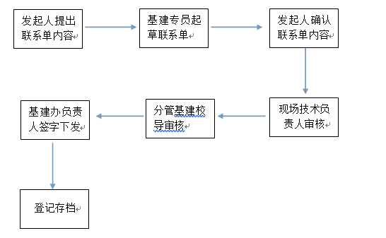 一、发起人提出联系单发起的原因和内容,由基建专员负责起草工作联系单;二、联系单起草完成后交给发起人审阅,并签字确认;三、将审阅通过的工作联系单交由现场技术负责人审核签字;四、由基建项目分管校领导审批签字;五、若审批通过,由基建部门负责人签发,并做好登记存档工作;若审批未通过,由基建专员负责通知发起人。六、以下为流程图:上海建桥学院基建项目工作联系单审批签发单文件名称发起人发起时间发起原因起草人起草时间发起人审阅意见技术负责人审核意见分管基建校领导审批意见基建部门签发意见备注