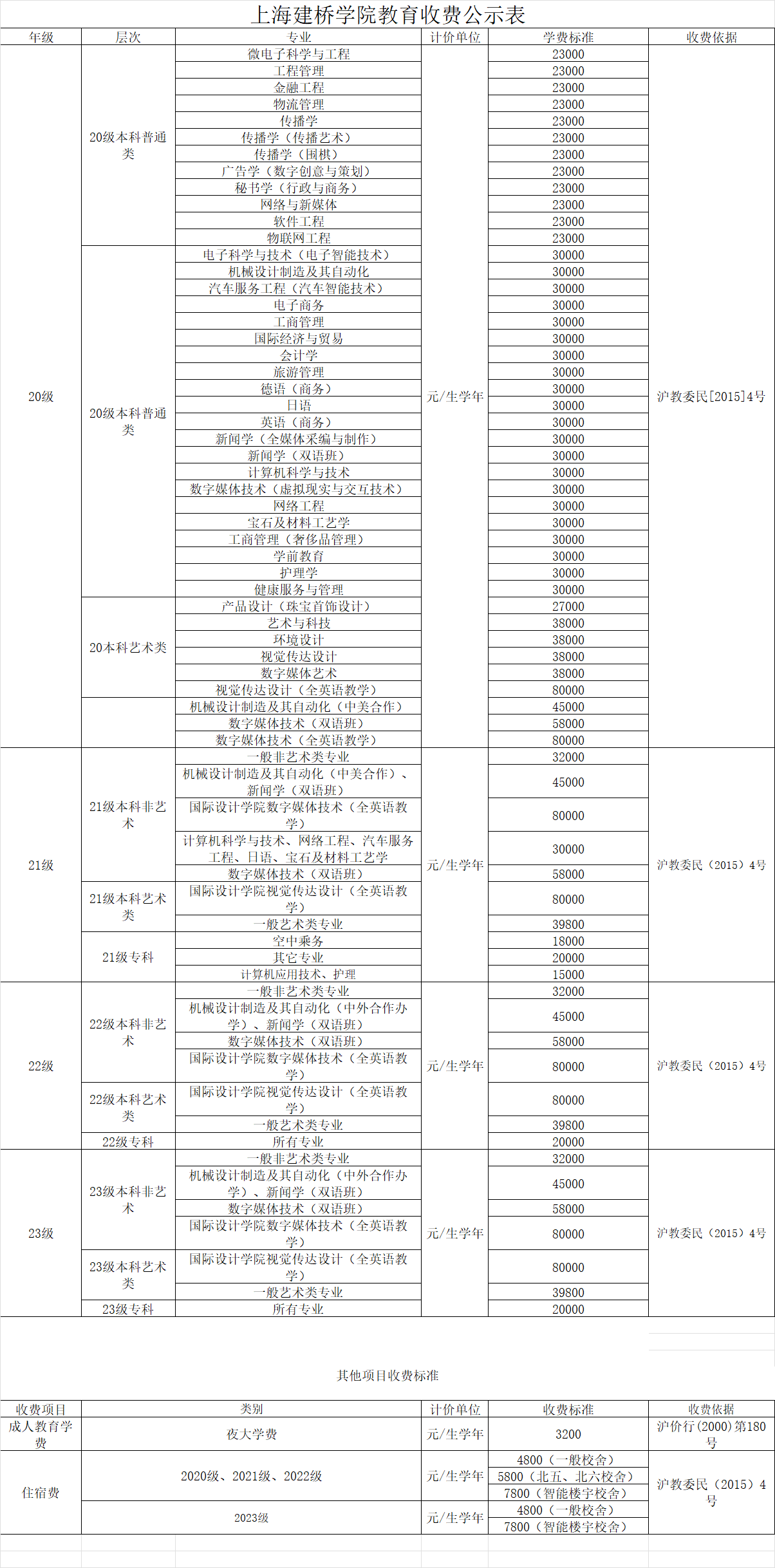 年级层次专业计价单位学费标准收费依据2020级2020级本科普通类微电子科学与工程元/生学年23000沪教委民[2015]4号工程管理23000金融工程23000物流管理23000传播学23000传播学(传播艺术)23000传播学(围棋)23000广告学(数字创意与策划)23000秘书学(行政与商务)23000网络与新媒体23000软件工程23000物联网工程230002020级本科普通类电子科学与技术(电子智能技术)30000机械设计制造及其自动化30000汽车服务工程(汽车智能技术)30000电子商务30000工商管理30000国际经济与贸易30000会计学30000旅游管理30000德语(商务)30000日语30000英语(商务)30000新闻学(全媒体采编与制作)30000新闻学(双语班)30000计算机科学与技术30000数字媒体技术(虚拟现实与交互技术)30000网络工程30000宝石及材料工艺学30000工商管理(奢侈品管理)30000学前教育30000护理学30000健康服务与管理300002020本科艺术类产品设计(珠宝首饰设计)27000艺术与科技38000环境设计