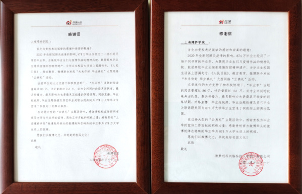 近日,我校收到新浪校园、微梦创科网络科技(中国)有限公司的感谢信,感谢我校参与由《人民日报》、微言教育、微博联合发起“未来你好 毕业典礼”大型网络“云典礼”活动。受新冠肺炎疫情影响,874万毕业生经历了一场不同寻常的毕业季。此次学校官方微博联合微博校园,一起在云端呈现了今年最有意义的毕业典礼,为毕业生送上母校最好的礼物。据悉,本次“毕业季”话题阅读量超过86亿,讨论量超过751万,成为新浪全网同时段最具活跃度、最具传播力、最具影响力,也是最具正能量的网络话题。