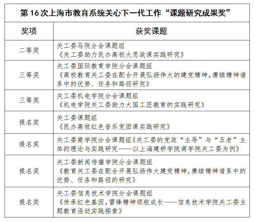 近日,上海市教育系统关工委公布第16次(2023年度)上海市教育系统关心下一代工作“课题研究成果奖”和第3次“课题研究优秀组织奖”的决定,我校获二等奖1个、三等奖2个,校关工委获“课题研究优秀组织奖”,校关工委课题研究工作取得新的突破。第16次上海市教育系统关心下一代工作“课题研究成果奖”奖项获奖课题二等奖关工委马院分会课题组《关工委助力民办高校大思政课实践研究》三等奖关工委国际教育学院分会课题组《高校教育关工委在配合开展弘扬伟大的建党精神,赓续精神谱系中的优势、任务和路径研究》三等奖关工委机电学院分会课题组《机电学院关工委助力大国工匠教育的实践研究》提名奖关工委课题组《民办高校红色音乐党团课实践研究》提名奖关工委商学院分会课题组《关工委的党政“主导”与“五老”主体的理论与实践研究——以上海建桥学院商学院关工委为例》提名奖关工委新闻传播学院分会课题组《教育关工委在配合开展弘扬伟大建党精神,赓续精神谱系中的优势、任务和路径的研究》提名奖关工委信息技术学院分会课题组《传承红色基因,雷锋精神领航成长——信息技术学院关工委主题教育活动实践探索》校关工委在校党委的领导下,积极发动和组织各二级关工