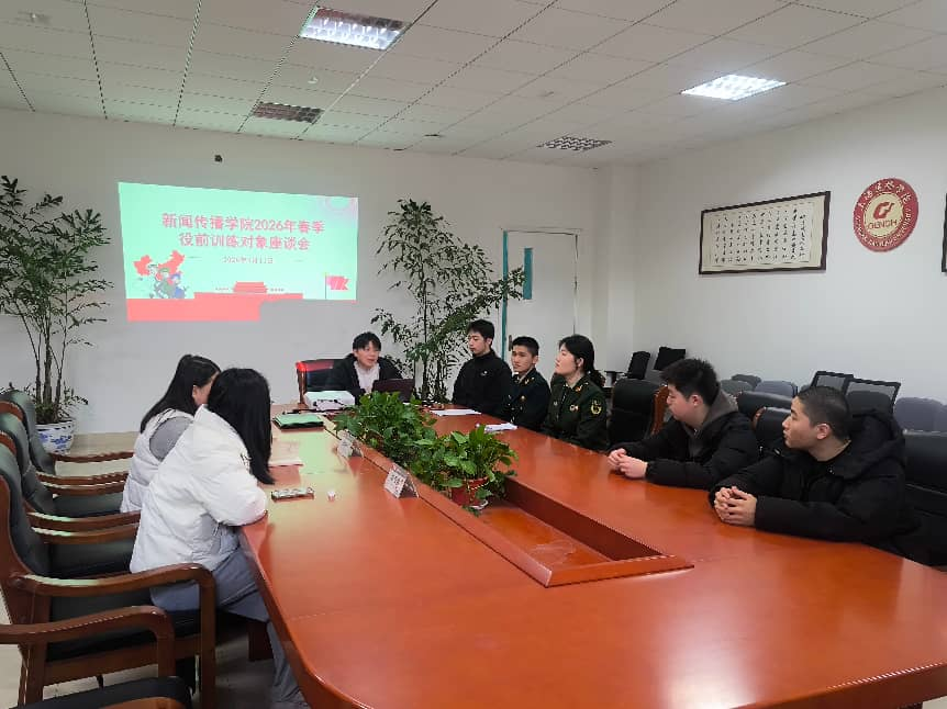 3月11日中午,新闻传播学院在学院楼219会议室举行2026年春季役前训练对象座谈会,为即将进入役前训练基地的杜任驰、宋忆两位同学送行。参加此次会议的有学院征兵负责人赵鑫老师、辅导员施艳林老师、靳雅丽老师、闻传当兵人协会会长马海珍及退伍学生刘俊杰、刘泽瑜。会议由学院征兵负责人赵鑫老师主持。会议伊始,赵鑫老师介绍了本次春季征兵工作的开展情况,并对即将参加役前训练的新兵们表示祝贺和期望,希望他们能够成为一名合格的军人,为国家和人民作出贡献。退伍学生刘俊杰、刘泽瑜先后分享了自己在役前教育基地及部队的经历。军营的生活不会是一帆风顺,随时将面临各种突发的情况,必定要经受风沙的磨练,才会茁壮成长。但只要肯学习,愿意付出自己的努力,军旅生涯会为人生绘出最浓墨重彩的一笔。随后,辅导员们分别介绍了学生在班级的优良表现,并对他们的军旅生活提出寄语,希望他们树立正确的政治观念和军事思想,在部队中磨练意志,在军营中彰显闻传风采,为建桥争光!