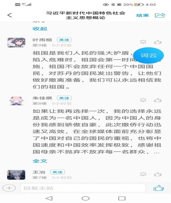 4月中旬苏丹发生武装冲突,中国公民和机构面临极大安全风险。党中央对此高度重视,习近平总书记就加强在苏丹中国公民和机构安全保护作出重要指示。外交部牵头,军队、各部门、地方人民政府、中资企业和驻外使领馆联动,通过5条路线将1500余名同胞安全撤出战火纷飞的苏丹,用行动践行人民至上、生命至上的崇高理念,彰显了用习近平新时代中国特色社会主义思想凝心铸魂的实际成效。这一次从苏丹快速撤侨,再一次引发热议,处处涌动爱国主义热潮。马院《习近平新时代中国特色社会主义思想概论》课程组及时抓住极好教育契机,组织学生讨论人民日报通讯报道“这就是祖国,你永远可以相信她”,在此基础上深入讲解“以人民为中心”思想,取得了很好的教学效果。全体任课教师高度重视这次教学实践活动,在“学习通”设置讨论题,要求学生发表看法。许多老师还专门组织学生在课堂上开展专题讨论,深入阐述这次撤侨事件所包含的深刻道理。例如,蒋成凤老师播放了“中国苏丹撤侨事件”的有关视频,然后,要求同学们针对两个问题展开讨论:我们国家为什么愿意花巨大代价把侨民全部撤回?假如你是侨民一员,你愿意对祖国说什么?学生在学习通讨论区积极参与,踊跃发言。蒋老师对网上