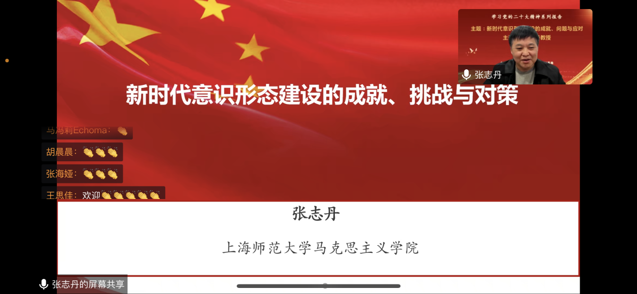 2023年1月4日晚,由上海市民办高校辅导员培训基地,上海建桥学院学生处,上海建桥学院马克思主义学院联合主办的学习党的二十大精神系列报告活动继续开讲,上海师范大学马克思主义学院院长、中央马克思主义理论研究和建设工程专家、国家社会科学基金重大项目首席专家张志丹教授应邀通过线上会议作“新时代意识形态建设的成就、问题与应对”专题讲座。报告会由马克思主义学院宋艳华院长主持,上海建桥学院全体辅导员和马院全体教师参加。意识形态工作是为国家立心、为民族立魂的工作。张志丹教授从意识形态和意识形态工作源起、新时代意识形态建设取得的成就、当前意识形态建设面临的挑战风险以及推进新时代我国意识形态建设的路径,结合二十大报告精神和我国意识形态领域前沿最新的理论与实践问题,作了一场视野宏阔、生动性与深刻性兼具、分析精辟、引人思考的精彩报告。张志丹教授指出,面对波谲云诡的国际形势、复杂敏感的周边环境、“三期叠加”艰巨繁重的改革发展稳定任务以及现代信息网络发展对意识形态控制力的消解,特别是立足和总结二十大报告中党带领人民在中华民族伟大复兴全局与当今世界百年未有之大变局下意识形态领域取得的来之不易的成就,指出要进一步加