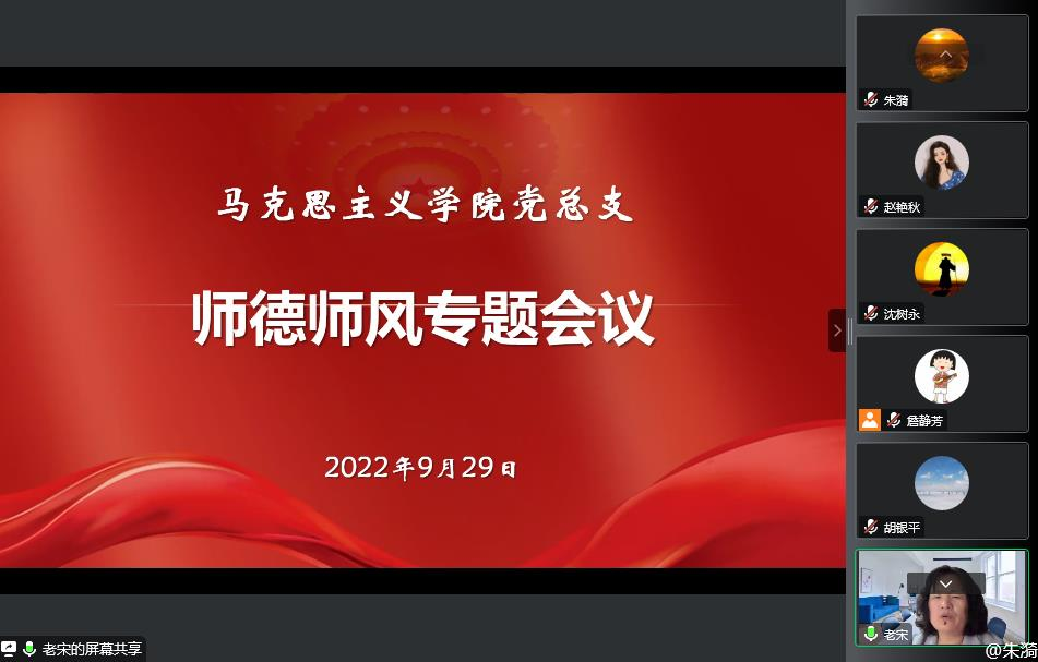 9月29日,马克思主义学院党总支召开师德师风建设专题研讨会。会议由学院党总支书记宋艳华主持,马院全体党员和教师参加了本次研讨会。宋艳华详细介绍了《马克思主义学院2022年师德师风建设月活动实施方案》,明确了深入开展师德师风建设的重要性,提出了师德师风建设的具体要求。强调思政课教师的思想政治素质是第一位的,必须要有坚定正确的理想信念和政治立场,必须要真信真懂真讲马克思主义,切实担负起立德树人的教育任务;强调师德师风建设要与大思政课建设和混合式教学模式改革结合起来,不断取得改革创新成果,不断提升思政课教学质量;强调老中青教师要相互学习,取长补短,共同进步,尤其是青年教师要在教学方法和科研方面多下功夫,多出成果。会前,党总支发布了孙正聿、周荣方等优秀思政课教师先进事迹的学习材料,并设置了“思政课教师如何强化责任担当,上好大思政课?”“思政课教师如何推进课程改革创新,提升思政课教学质量?”等思考题。全体教师围绕思考题展开热烈讨论,取得了凝聚共识、鼓舞士气、明确任务、找准方向的研讨效果。老教师们介绍了数十年从教的经验与感受,纷纷表示要再接再厉,再立新功的想法。李玢表示要千方百计调动学生学习积极性