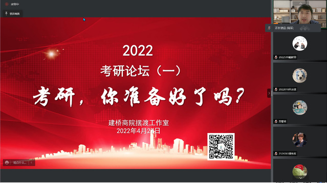 为了帮助意向考研学子坚定考研信心、解决考研过程中的困惑、提升考研能力,同时也发挥已上岸学长学姐的考研帮扶作用,我院于2022年4月27日 19:00在腾讯会议上举行了首场考研论坛。本次论坛由陆军老师主持,论坛邀请到今年考研上岸的丁昊、苏馨垠、李弘、周丽四位同学担任分享嘉宾,19级和20级意向考研的同学参加。首先由陆军老师从商学院考证考研指导中心成立的宗旨、今年商学院考研的录取情况及特点、针对19级考研的举措三个方面展开。陆老师重点分析了今年考研的形势,对2023年考研的学生提出了一些有效的建议。接下来,丁昊、苏馨垠、李弘、周丽四位同学分别分享了各自的考研经历,四位同学从考研学校和专业的选择到考研备考过程中的学习方法、心态调整等进行了深入细致的分享。四位同学分享之后,意向考研的学生积极提问,向他们了解更多的考研问题,四位同学也积极答复,并且留下各自的联系方式,便于进行进一步的交流。商学院高度重视学生考研工作,为考研学生提供多方位多渠道的考研服务。考研论坛的举办就是众多服务中的一项。本次考研论坛的举办,让同学们考研的决心更加坚定,为还在迷茫的同学解答了疑惑。期待更多的考研学子能够圆上岸梦。
