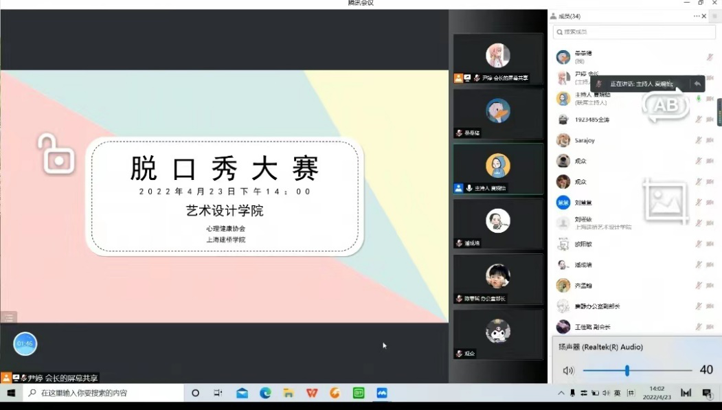 为进一步丰富学生课余生活,营造良好校园文化氛围,艺术设计学院于4月23日下午两点,在腾讯会议上举办脱口秀大赛,比赛邀请到了校心理中心齐孟翰老师、学院全体辅导员作为评委。本次比赛共有来自不同年级不同专业的12位同学参加,由2020级数艺1班夏婉怡同学和数艺3班尹婷同学主持。比赛伊始,主持人以幽默风趣的对话开场后,选手们按抽签顺序依次进行展示。每位选手都精心准备了自己的脱口秀绝技,所讲内容紧紧围绕“自我认识”“压力应对”“人际沟通”“亲密关系”“生命意义”“个人成长”“心理科普”等心理健康相关主题,激发出大学生的内在成长动力。赛场上选手们畅所欲言,风格各异,现场“包袱”、段子频出,观众笑声不断,气氛十分活跃。赛后,齐孟翰老师对各位选手的表现一一进行点评。经过激烈的角逐,视觉B20-1朱婧同学凭借精彩的内容和出色的脱口秀表演获得本次大赛的一等奖,数艺B20-1俞典同学和视觉B21-3龚天钰同学获得二等奖,艺科B21-3钱宇涛、环艺B21-5周奇杰、环艺B21-3褚蒋怡三位同学获得三等奖,其他同学获得优胜奖。同学们纷纷表示心理健康主题脱口秀的形式非常新颖,在准备过程中不仅学习到了心理健康的知识