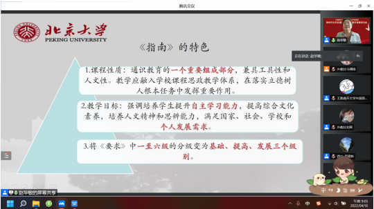 2022年4月16日(周六),由教育部高等学校大学外语教学指导委员会日语组、中国日语教学研究会和上海外语教育出版社联合举办的“引领新时代发展 构筑大外语格局·新时代大学日语课程建设与教学发展研讨会”在腾讯会议上举行,本次会议设主旨报告、专题报告、教学分享、分组研讨四大模块。上海建桥学院外国语学院日语系主任刘尔瑟参加了此次研讨会,并在下午的第八分会场与其他高校的日语专业负责人和大学日语负责人就目前的大学日语课程建设和教学改革等问题进行了交流和讨论。(北京大学赵华敏教授讲座)(北京外国语大学周异夫教授讲座)(西安外国语大学毋育新教授讲座)(浙江外国语学院吴玲教授讲座)(吉林大学房颖副教授讲座)(第8分科会研讨)会议当天,北京大学的赵华敏教授就教育部高等学校大学外语教学指导委员会日语组近期公布的《大学日语教学指南》进行了深入解读。北京外国语大学的周异夫教授从新文科背景下探讨了新时代日语人才培养与教学改革。西安外国语大学的毋育新教授以西安外国语大学为例,分享了新高考背景下大学日语课程建设的经验。浙江外国语学院的吴玲教授分享了大学日语智慧教学的理论发展历程和实际教学过程中的智慧教学手段的具体运用