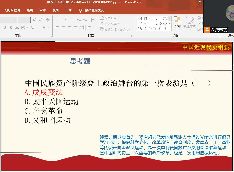 自线上教学工作开展以来,《中国近现代史纲要》课程的课程负责人费志杰老师通过智慧树、对分易、腾讯会议等线上平台进行授课,认真总结线上教学的特点,针对线上教学问题设计出有效的解决方法,提升了线上教学质量,得到了一致好评。多平台,环环相扣进行授课。费志杰老师的线上教学运用智慧树平台为主,根据智慧树平台视频观看学习习惯规则,按照教学进度要求学生观看,然后进行学生网课观看情况的点评,适时解决未确认、未注册等情况,对没有学习及进度过慢过快的同学做出提醒,并限期改正。还会在对分易课程资源区发布电子版教材、学术文章、教学视频等课程资源,公布教学大纲、教学进度、课程题库等教学材料。另外,他鼓励学生克服疫情管控的困难条件进行情景剧创作,通过腾讯会议让学生远程共享屏幕进行视频播放,学生在聊天区刷屏踊跃为视频展示小组的精彩演绎打分点评。此项展示活动让学生重温和学习了历史知识、体悟了重大历史事件。云端互动,注重学生学习状态。针对网课内容及前次课内容,费志杰老师抽点学生回答问题,带领全班同学进行前后知识点衔接,当抽点学生未给出正确答案时,开放给全班同学抢答,为第一个提供正确答案的同学给予一定分数。还通过教学互动,