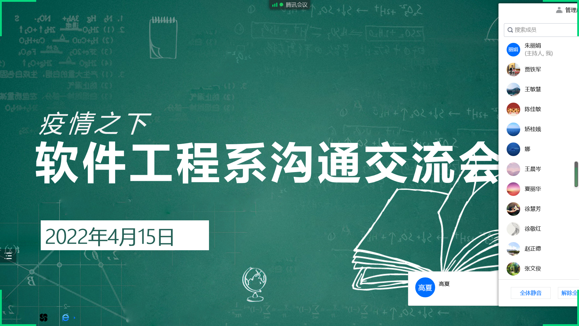 2022年4月15日软件工程系招开了线上沟通交流会,参加会议的除了软工系全体教师以外,还有学院领导张文俊、书记王晨岑、副院长矫桂娥和副书记徐娜参加了此次会议。首先软工系朱丽娟老师将疫情以来与系相关的事情对全体老师做了阐述,重点落在教学、实习就业和论文答辩上,包括各门课程的线上考试预案、实习就业的状况,以及论文指导、评审和答辩的各个环节。接下来学院党委书记王晨岑老师表达了对老师们这段时间辛苦的慰问,并倾听了老师们的教学需求,包括对学生的学风、学习环境的监督做了现场的及时部署和安排。党委副书记徐娜老师传达了学校目前的疫情状况,并表示一定最大程度的保障学生的学习条件,与辅导员一起做好学生学习的监督工作。王书记还就学生的实习就业问题,提了一些观点和要求,并请赵正德老师分享了如何做好学生的实习就业工作。最后,学院张文俊院长在整体工作上对老师们的辛勤付出,表示了肯定,希望大家齐心协力渡过难关。矫桂娥副院长教学安排、工程教育认证等具体工作上对老师们提出了要求和希望。软件工程系感谢学院领导参加本系的沟通交流会,感谢他们的慰问以及指导性的工作和建议。软工系的老师一直都在尽职尽责地做好自己的教学工作和