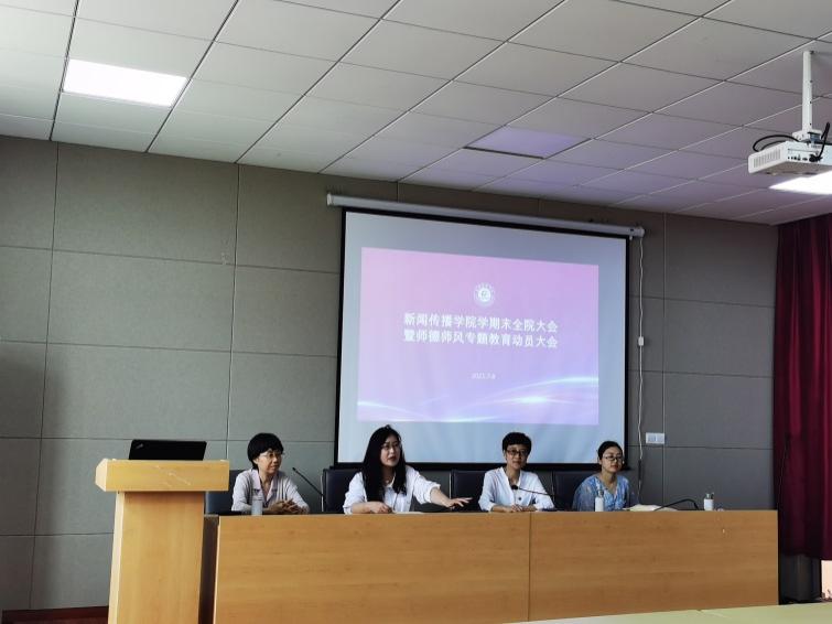 为深入贯彻习近平新时代中国特色社会主义思想和习近平总书记关于教育的重要论述,全面落实上海市教育大会精神,进一步加强上海高校师德师风建设,规范教师职业行为,新闻传播学院于2021年7月8日,在学院楼308召开师德师风专题教育动员会,新闻传播学院党委书记徐磊教授主讲,新闻传播学院院长王梅芳、副院长田欣欣、党委副书记吴成皓及全体教师参加。徐书记依据教育部《关于在教育系统开展师德专题教育的通知》要求,结合学校相关要求和学院实际情况,从以下几方面重点开展师德师风建设活动:一是组织深入学习习近平总书记关于师德师风的重要论述,增强“四个意识”,坚定“四个自信”,做到“两个维护”,弘扬高尚师德,潜心立德树人;二是以党史学习教育为主线,强化教师“四史”学习教育;三是开展师德优秀典型先进事迹宣传学习,持续选树宣传教师优秀典型,用身边的榜样传递师德的力量;四是引导教师学习践行新时代师德规范。深入学习《新时代高校教师职业行为十项准则》,抓实学习督导和效果测评,确保每位教师知准则、守底线;五是集中开展师德警示教育。定期组织教师召开师德警示教育大会,由学院(系)组织,以教育部网站公开曝光的违反教师职业行为十项准则