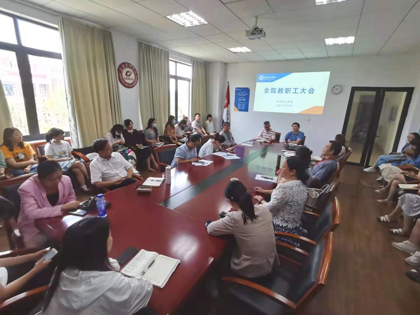 7月9日下午,职业技术学院召开学期末全院教职工大会,总结和通报一学期工作,部署暑期相关工作。谷伟院长主持会议,全体教职工参加。会上,谷伟院长、王加宁书记、汤以范副院长、马冯莉副书记、陈少东主任等分别就各自分管的工作进行了学期回顾和总结,并对近期和暑假的相关工作进行了部署安排。汤以范副院长结合期末考试考务工作,针对期末考试阅卷评分登分、试卷归档、下学期课程安排等提出要求,强调要及时客观做好阅卷、评分、登分上网工作,做好下学期开学准备工作。马冯莉副书记通报了目前学院毕业生就业签约情况,指出临近就业工作末期,大部分专业毕业生就业接近工作目标,但也有小部分专业存在个别就业困难学生,需要加强专门引导,指导学生尽快找到工作单位。院办主任陈少东就暑期教职工安排进行了通报说明并提醒注意事项,希望各位教师暑假期间做好疫情防护,避免参加大型聚集活动;注意劳逸结合。王加宁书记讲话指出,本学期在全体教职工的努力下,顺利完成了各项工作,取了较好的成绩。同时强调,当前就业工作进入冲刺阶段,做好特殊群体学生就业指导,是当前重要工作,要针对性地开展工作,精准帮扶,特别是要发挥专业主任的作用,重点引导和突破。要提前谋划