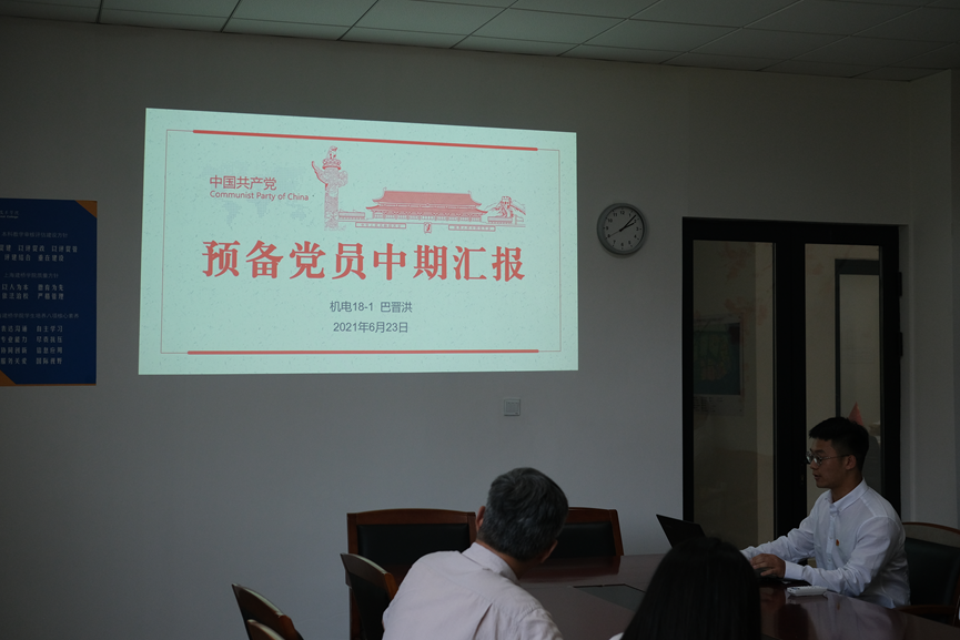 6月23日下午,职业技术学院在会议室247开展“学党史 践初心”主题教育之预备党员中期汇报,学院党委书记王加宁、组织委员廖艺晗、各学生支部书记以及2021届毕业生预备党员参加此次汇报。预备党员们分别从学习强国分数、理论学习、实习就业情况以及发展至今所发挥的党员模范先锋作用几个方面开展。黎璎珞:通过学习强国看视频的方式学习党史,作为班级的团支书,积极带领班级同学参加青年大学习。临近毕业,做好班级里团组织关系的转移。实践中,与父母积极参与小区垃圾分类站岗的志愿者活动中。巴晋洪:自身的理论扎实,学习成绩扎实,才能更好地发挥模范作用,实践中积极参加中国国际进口博览会志愿者,在今后学习和工作中继续加强政治理论学习和专业学习能力,严格要求自己。许杨:今年是中国共产党成立100周年,在学习阅读党史中,更加明白党百年历程中的艰辛不易,身为预备党员的自己,要规范好自己的言与行,积极热情投入到实际行动中去。潘紫莹:每天坚持进行学习强国学习打卡,通过学习党史、参观烈士陵园,更加懂得当今美好生活的来之不易,这都是革命先烈通过鲜血打拼下来的,作为后辈的自己,也会在实际行动中不断增强社会责任感,冲锋在前。汇报结束