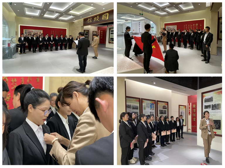 2021年5月17日,上海建桥学院外国语学院的17名新发展党员在国政馆展开了庄严的入党宣誓仪式。伴随着庄严的《国际歌》,主持人易贤恒老师宣布仪式正式开始,及宣读新发展党员名单,并对加入党组织的“新鲜血液”表示热烈的祝贺与欢迎。随后,伊莉副书记做领誓人,带领着17名新发展党员宣誓,他们面向鲜艳的党旗,握紧右拳,郑重宣誓,向党组织表达自己坚定的决心和不变的信念。接着,伊莉老师、田珊珍老师和赵磊老师分别为新发展党员佩戴党徽并道贺词,三位老师对新发展党员们提出了殷切期望,强调入党不只是形式上入党,更重要的是思想上入党,勉励大家要牢记党的宗旨,发扬党的优良传统,坚定为共产主义理想奋斗终身的信念。最后,党委副书记伊莉老师开展新党员的入党后的第一次党性教育活动,带领17名新发展党员参观国政馆并进行讲解。通过对国政馆的讲解,给大家上了一堂形象生动的党课,希望大家深刻领会、认真践行,要在日常工作中发挥好党员的先锋作用、表率作用,时时检视自己,以一名党员的标准严格要求自己,为党的事业贡献青春和力量。习近平总书记曾经强调,“入党誓词字数不多,记住并不难,难的是终身坚守。每个党员要牢记入党誓词,经常加以对照,