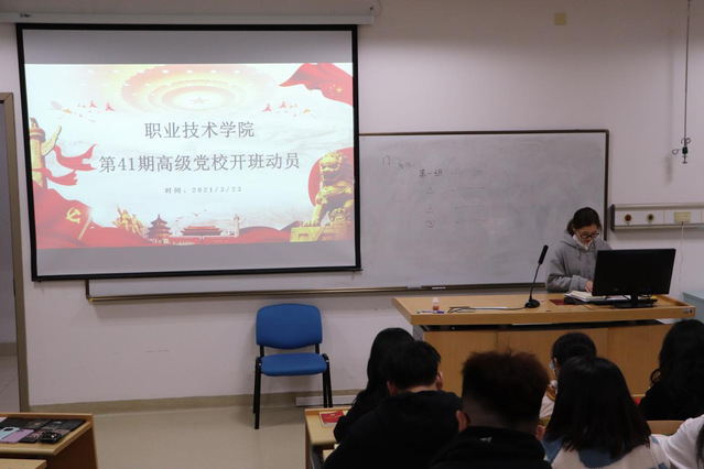 3月22日晚21点,职业技术学院第41期入党积极分子高级党校培训班动员大会在职院206教室如期举行。职业技术学院党委组织委员马冯莉老师、校党校部干事、高党班长潘晨怡以及高党学员参与此次活动。高党班长潘晨怡首先详细讲解了此次高党的学习计划安排,并对学习组织提出一定的要求,希望每一位学员都可以以严谨认真的态度对待每一堂课,以刻苦的精神投入学习,自觉高标准严要求,认真参加每次活动。马冯莉老师表示高党培训班是为党组织输送人才的培训班,时值百年建党,举国同庆的岁月里,希望同学们能更自觉、更主动的学习党的光辉历史,通过党课学习,做到知党爱党,同时也希望大家在日常生活学习中多磨练、多反思,在各项活动中起到先锋模范作用。会后,高党学员就实践项目(红色服务队)作了分组安排。