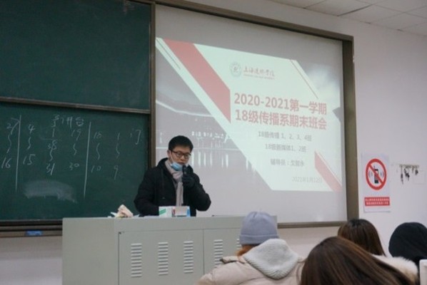 1月12日晚,新闻传播学院18级传播系在教学楼1教召开2020-2021学年第一学期期末班会,会议由辅导员戈智永老师主持。18级传播系208名学生参加。戈老师主要从“学期总结”、“诚信教育”、“假期安全”、“就业动员”进行重点说明“学期总结”方面,戈老师首先强调了毕业条件,并提醒学生严格审核自己,查缺补漏;其次戈智永老师说明了“三证”通过情况,重点强调四级通过率;接着戈老师对各专业本学期取得的荣誉和处分情况进行总结,提醒学生们要注意好日常学习、生活、社区管理等方面;“诚信教育”方面,戈老师宣读考试诚信承诺书,并强调考试过程的注意事项。各门课考试,必须做到“诚”字为先,这是一个的学生应具备的基本素养,也给学弟学妹做好诚信榜样;“假期安全”方面,戈老师强调两点:一是按照疫情防控工作最新要求和实际,学生离校必须事先向辅导员报告,同时在“建桥i健康”中如实填报当前所在地和计划行程,并加强个人防护;二是假期在家不聚集、不集中,做好个人健康管理;“就业动员”方面,戈老师强调了大家已经面临毕业,必须考虑好个人的职业规划与做好就业准备等,多与老师长辈们沟通交流,向优秀的学长学姐学习经验,多途径、多方面