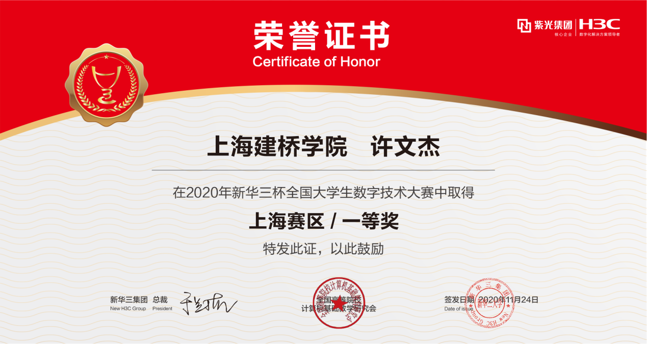 11月27日,2020年“新华三杯”全国大学生数字技术大赛预赛成绩正式公布。信息技术学院获得1个一等奖,3个三等奖的好成绩。许文杰同学获得市赛一等奖,进入国赛。“新华三杯”全国大学生数字技术大赛由新华三集团和全国高等院校计算机基础教育研究会联合承办,旨在推动学生、院校、企业三方互动,“以赛促学习、以赛促教学、以赛促就业”,积极探索应用型人才培养思路,丰富多元化人才培养体系,建立良性的就业生态圈。本次大赛采用笔试方式,用电子试卷进行,主要考察学生对云计算、大数据、SDN、网络、安全、无线等当今信息产业主流技术的理论掌握水平。我院高度重视,认真组织,细心指导。许文杰、黄子福、梁江山、叶梓炜4位学生在网络工程系主任蒋中云的细心指导下,认真备赛,沉着应赛,获得佳绩!2010年至今,新华三杯大赛已成功举办9届,累计3200多所院校近4万人参与比赛,万余名选手脱颖而出,成功就职于新华三集团及其人才联盟企业。通过积极参与比赛,借助校企合作平台,促进产教融合,为信息技术人才扩展眼界,推动专业群发展。