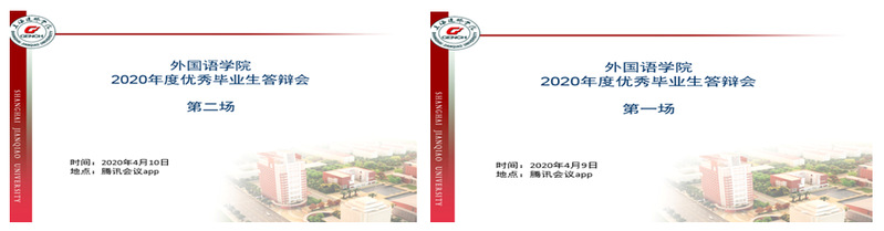 4月9日下午和4月10日下午,外国语学院分两次组织召开了2020届本科生上海市优秀毕业生和上海建桥学院优秀毕业生答辩评审会。本次会议为线上网络会议,以“视频+PPT汇报+评委老师提问”的形式进行,参与答辩的优秀毕业生候选人共43人,外国语优秀毕业生评审小组全体成员参与了此次答辩评审工作。答辩工作由彭艳虹老师主持。主持人介绍了此次答辩的评审组老师、候选人名单和顺序、答辩的规则、主要内容和形式,并强调了时间的限制。43名候选人依次开始展示自己的PPT,通过学习、工作、生活、兴趣爱好、未来展望、获得荣誉、志愿活动等多方面总结自己在大学期间的收获和感悟。评委老师针对候选人的PPT内容和讲解提出问题、建议,都得到了积极的反馈和回应。为实现公平公正,全部过程均录音录屏保存。答辩过程中,各位候选人与老师的问答互动都很活跃,并表示会牢记八字校训“感恩、回报、爱心、责任”,不忘本,走出社会后,继续努力提升自己,积极找工作,为母校争光、为社会做贡献。答辩结束后,评审小组组长、党总支书记江萍老师对此次答辩做了总结,对候选人在校的优异表现表示赞扬和欣慰,提醒他们疫情期间保护自己,并从个人品质和社会责任两方面对