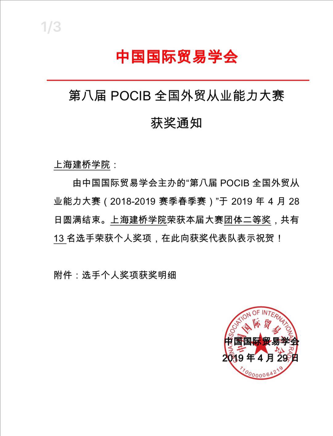 近日,由中国国际贸易学会主办的“第八届POCIB 全国外贸从业能力大赛(2018-2019 赛季春季赛)”圆满结束。由我校20名16级国际经济与贸易专业学生组成的代表队在为期20天的激烈角逐中顽强拼搏、团结奋战,获得了团体二等奖的好成绩,并且有13名选手获得了个人奖项,创造了我校国际经济与贸易专业参加此项赛事以来的最好成绩。