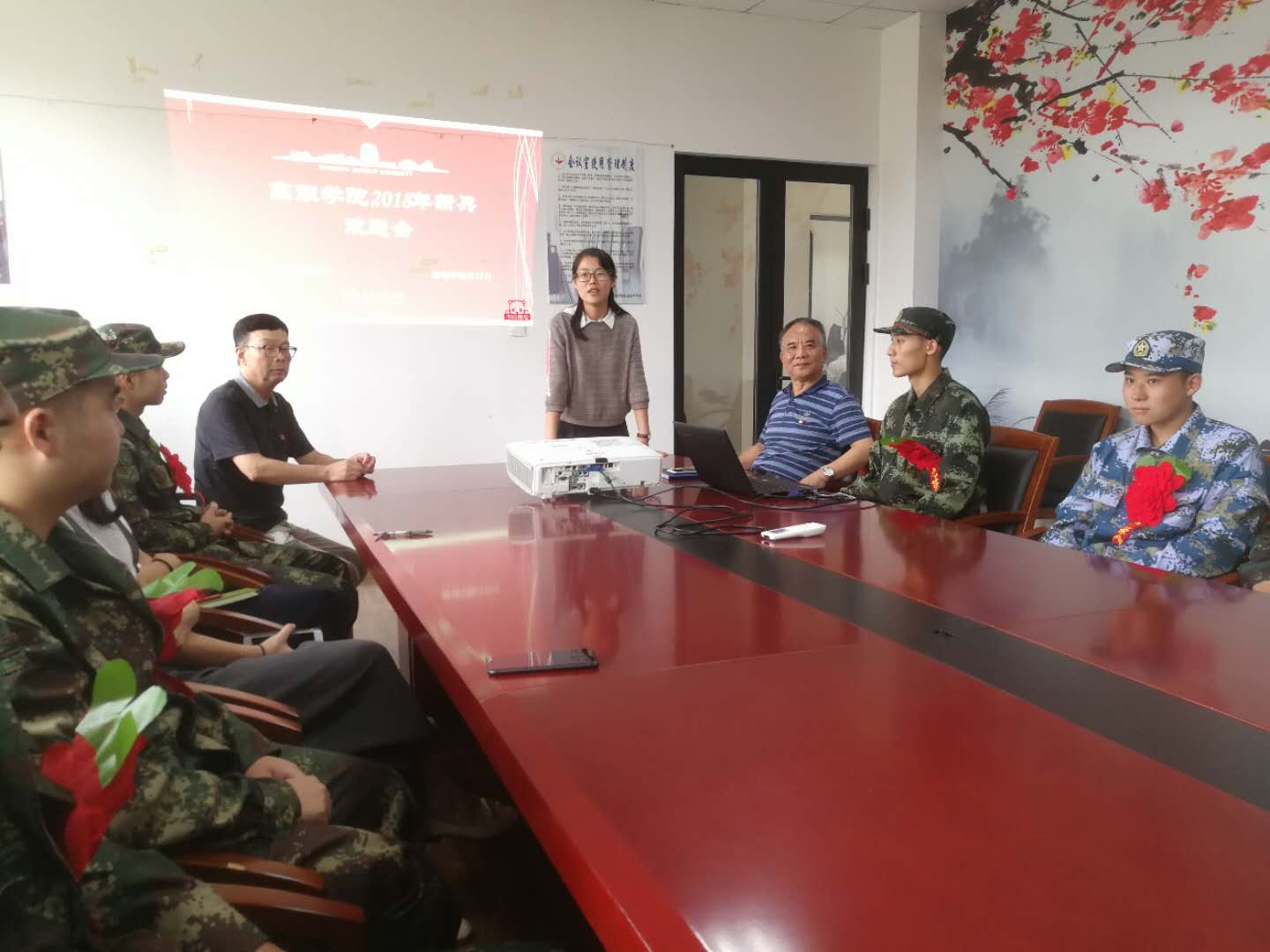 9月17日下午,高职学院秋季新兵欢送会在学院247会议室隆重举行。高职学院院长焦庆堂、党总支书记王加宁、副书记潘明芸出席会议,即将入伍新兵和相关辅导员参加会议。会议由潘明芸副书记主持。