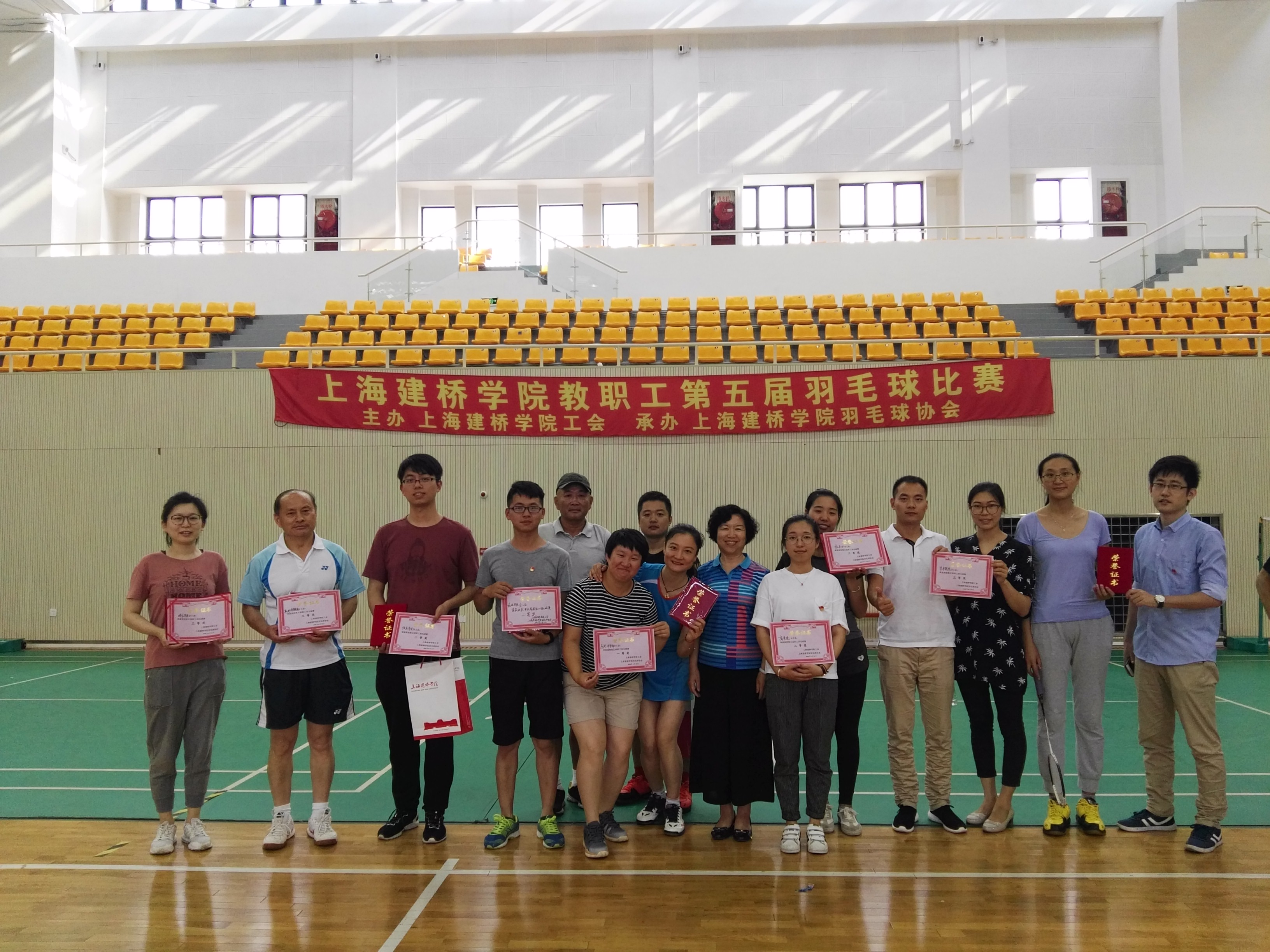 为增强我校教职工体质、促进教职工之间的沟通交流和友谊,6月13日,由校工会主办、校羽毛球协会承办的上海建桥学院第五届教职工羽毛球团体比赛在体育馆举行。羽毛球比赛自举办以来,在全校教职工中受到广泛关注和热烈欢迎,此次比赛吸引了13个分工会70余位教职工的积极参与,是历次参赛人数最多的一次。中午,工会副主席潘秀玲主持开幕式后,校董施银节和羽毛球协会会长贾存忠老师一起为比赛开球。各代表队积极参赛,赛场上激情四射,选手们大展身手。强有力的挥拍,灵活转体,高技巧的搏杀,使羽毛球运动的魅力感染全场。场馆内人头攒动,队员们精彩的对决吸引了不少前来加油助威的拉拉队,领队们则一边精心安排各队员的出场顺序,一边指导队员如何进攻防守;各代表队所在分工会积极配合,做好队员的后勤保障工作。与以往赛制不同,此次比赛采用第一阶段分组单循环制和第二阶段交叉淘汰制,每轮比赛包括两局单打和一局男女混合双打。最终,经过激烈的角逐,马院体育部分工会夺得头筹,机电学院分工会、商学院分工会以及信息学院分工会获得亚军,新闻学院分工会、珠宝学院分工会、信息学院分工会、艺术学院分工会以及机关四工会并列第三名。撰稿:阿利亚、孟丽