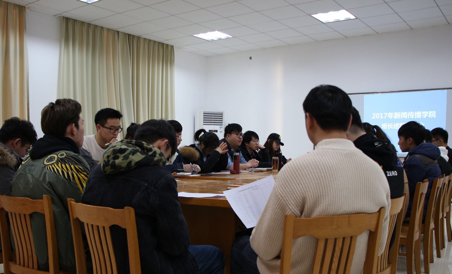 1月9日下午,新闻传播学院2017年班长述职评议会于学院楼225顺利展开。本次会议的主要内容为各班班长进行述职报告,总结学期班级工作以及对今后班级发展的规划,再由班长之间互相打分评定。出席本次会议的有学工办主任毛东宇,辅导员刘林艳,新闻传播学院分团委学生会干部以及16、17级全体班长。会议上,各班班长主要围绕“班长的自我要求、班风学风的建设、班级成绩以及未来发展方向”三个模块进行报告。17新闻一班的班长张无忌先是从学风建设和班级建设两方面总结了他在班级本学期的工作,紧接着,他反映在下学期会积极召开班委会以及班级活动,进一步管理班级,改善班风。16新闻全媒体一班的班长蒋湾将本学期班内大小活动进行说明,并详细地一一总结,他表示,本班出勤情况良好且班级凝聚力强,下学期将继续努力保持。最后,由毛老师总结本次会议。他表示,17级班长在述职报告中还存在诸多问题,此处应积极与16级班长进行交流,向他们学习。毛老师指出:“做好班长对于班级意义深远。各班具有各班的特点,班长们要根据班级的自身情况,采用不同的方法进行管理。在遵守班级规章制度的前提下,班长要学会主动发展各班同学的不同个性,适当组织活动,提升