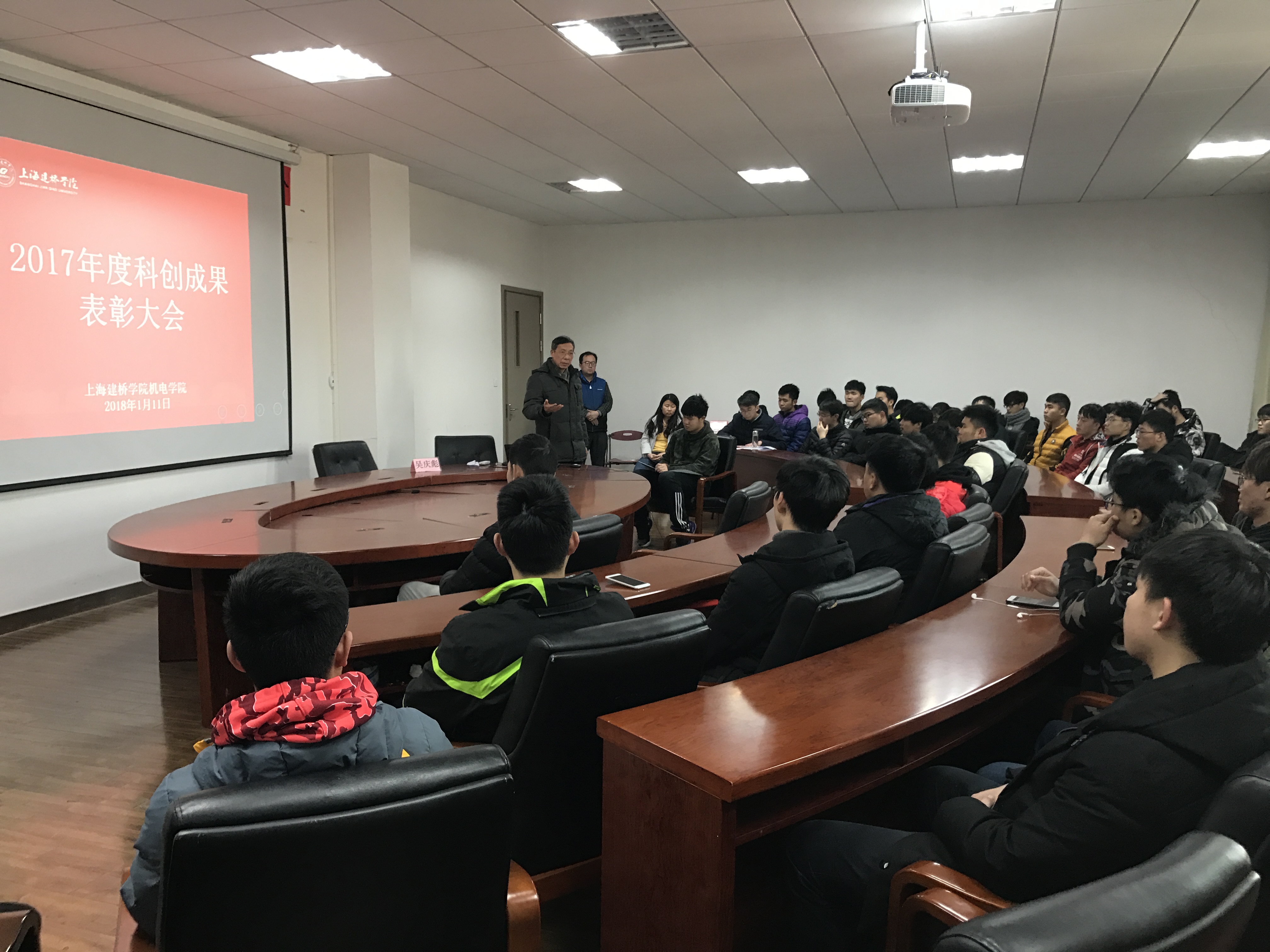 2018年1月11日下午15:00,机电学院在学院会议室开展2017年度科创成果表彰大会,参加本次会议的有吴庆彪教授、刘立华老师、获奖团队以及广大有意投身科创成果研发的机电学子。刘老师首先以11月份创造杯比赛的佳绩为例,给同学们鼓舞信心,使得同学们知道创造并非那么困难。接着吴教授指出,国家科技水平在逐渐提高,机械设计制造在中国的发展方面有很大的进步空间,科技人员越来越年轻化,还有很多发展的空间。吴教授强调,以后科学技术方面就是年轻人的天下,年轻人是提升中国科技创造力不可缺少的一部分。同时,吴教授为同学们参加比赛获得成就,感到十分的欣慰,他也认为上海建桥学院已经具备和全国的各大名校竞争的实力,鼓励同学们积极参加活动比赛,让同学们通过努力,培养思维的方法,懂得如何解决问题。想要申请自己的专利并不是一件难事,应当站得高,看得远。最后的颁奖仪式,由团队代表上台领奖,旨在鼓励所有学子,在科创的道路上,再创佳绩。感谢本次出席的老师和学长学姐,你们是良师,更是益友,我相信有了老师们的指导,机电学子在科创的道路上将创造出更加辉煌的明天。