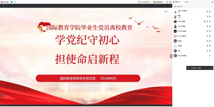 国际教育学院学生党支部于6月19日晚采用线上线下结合形式开展“学党纪守初心 担使命启新程”毕业生党员离校教育活动,活动由学生党支部书记杨静老师主持,全体毕业生党员参与此次活动。活动伊始,杨静老师首先回顾了毕业生党员们在国际教育学院度过的青春岁月,并对他们为学院、为社会所做出的贡献给予了高度评价。她强调作为一名共产党员,要时刻保持对党的忠诚和信仰,无论身处何地,都要牢记自己的初心和使命。接着,杨静老师围绕“学党纪守初心 担使命启新程”这一主题,向毕业生党员们详细解读了党的纪律和规矩,强调了遵守党纪的重要性。她指出,作为一名共产党员,必须严格遵守党的纪律,不断提高自己的政治觉悟和党性修养,始终保持清醒的头脑和坚定的立场,她鼓励毕业生党员们要勇于担当,积极履行自己的社会责任和使命,在各自的岗位上发光发热,为实现中华民族伟大复兴的中国梦贡献自己的力量。最后,杨静老师对毕业生党员们提出了殷切的期望。她希望大家在未来的工作和生活中,能够严守党纪党规,永葆初心本色;勇担时代使命,贡献青春力量,为实现中华民族伟大复兴的中国梦贡献自己的力量,同时,她也祝愿大家前程似锦、事业有成。通过这次活动,不仅增强了